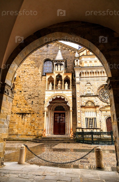 Бергамо, Италия. Капелла Коллеони в Бергамо. Историческая часть города. Дождливая погода