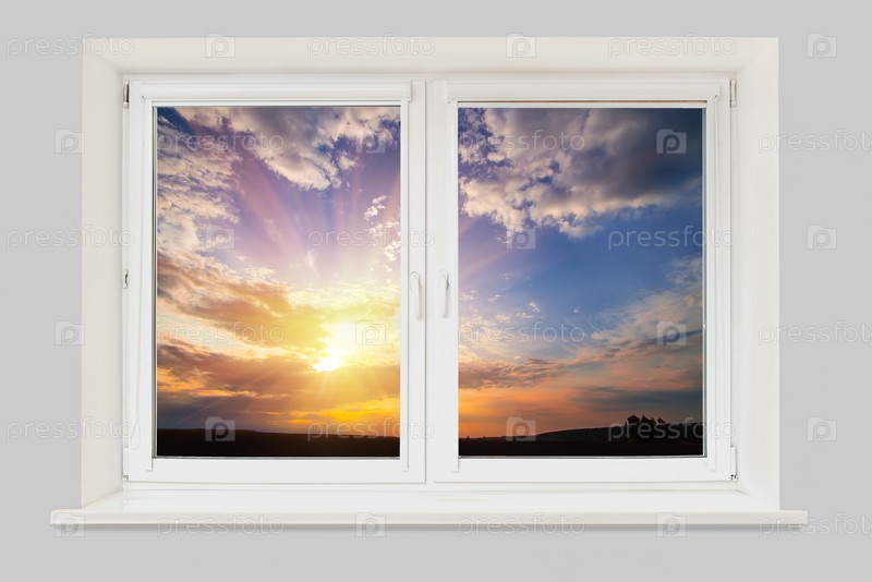 Вид из окна на закат в облачном небе над полем