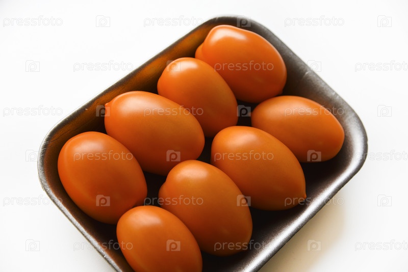Оранжевые спелые помидоры на пластиковой подложке. Вкусные помидоры в упаковке из магазина на белом фоне. Желтые помидоры крупным планом. Продолговатые желтые помидоры