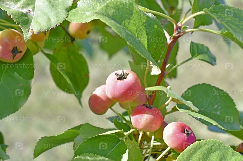 Красные и желтые маленькие плоды дикой яблони на ветке