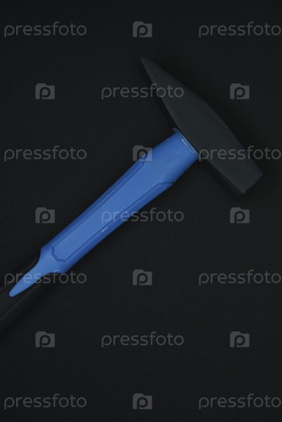 Строительный молоток на черном фоне. Плотницкий молоток с синей ручкой на черном фоне