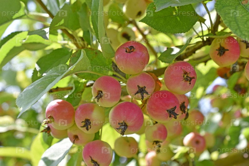 Красные и желтые маленькие плоды дикой яблони на ветке