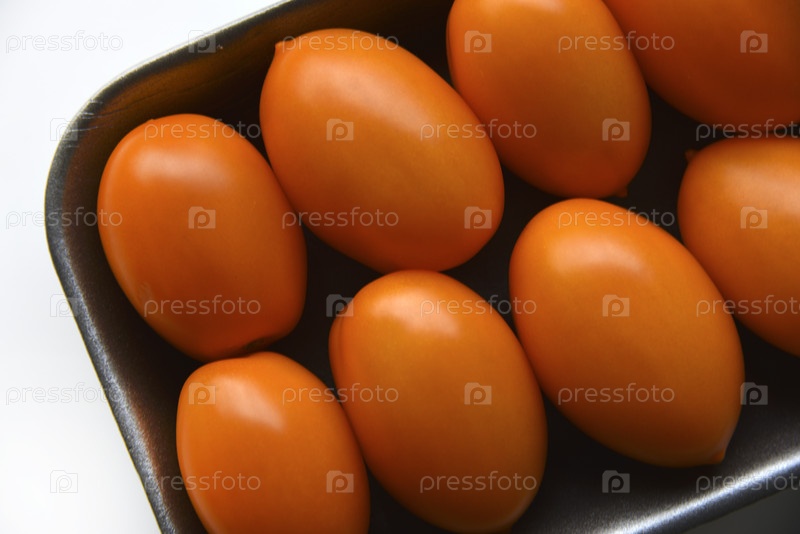 Оранжевые спелые помидоры на пластиковой подложке. Вкусные помидоры в упаковке из магазина на белом фоне. Желтые помидоры крупным планом. Продолговатые желтые помидоры