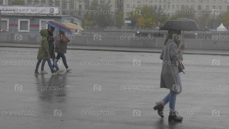 Две девушки гуляют под одним зонтиком в парке вдоль набережной
