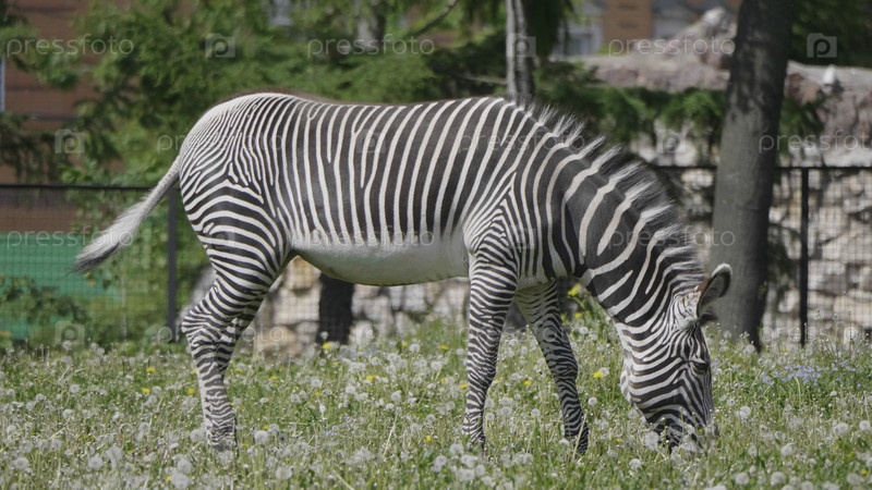 Африканская красивая зебра ест свежую зеленую траву