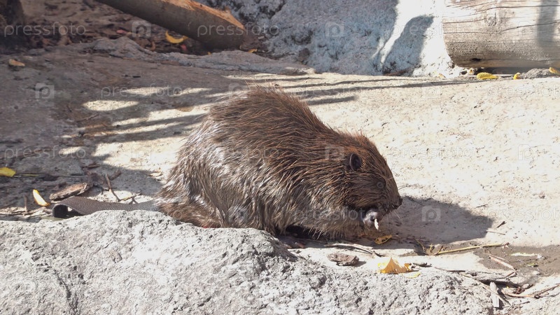 Бобер грызет ветку дерева на озере., Бобер грызет ветку дерева на озере