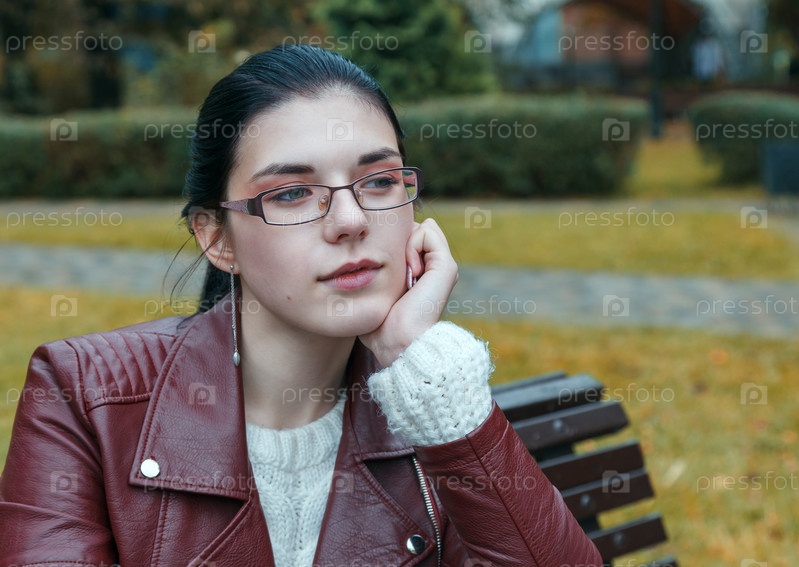 Молодая девушка в коричневой куртке и черных джинсах сидит на скамейке в парке осенью. портрет крупным планом
