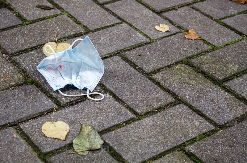 Защитная медицинская маска с отпечатком помады, лежащая на тротуаре. крупным планом открытый