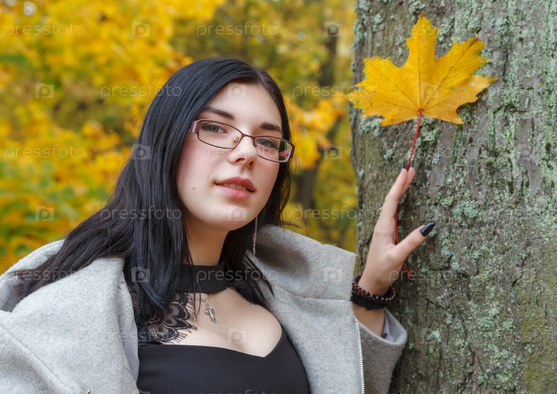 Молодая девушка держит в руке желтый кленовый лист в парке осенью. портрет крупным планом