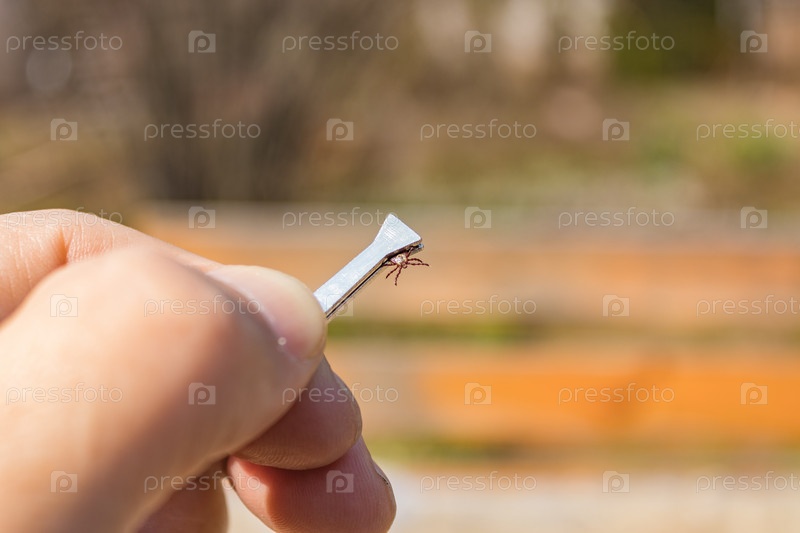 Клещ Ixodes ricinus захватывается металлическими щипцами на руке.Весенний энцефалит.Этот вид животных является переносчиком боррелии