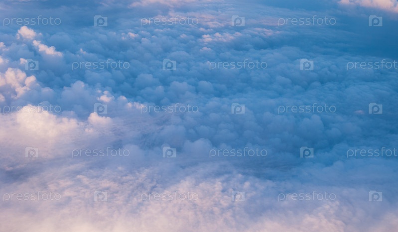 Вид сверху на облака и голубое небо из окна самолета, фон природы