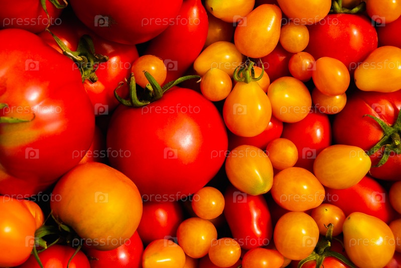 Сочетание красных и желтых спелых помидоров разного размера в качестве фона