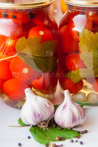 Консервированные помидоры в стеклянной банке, чеснок и приправы