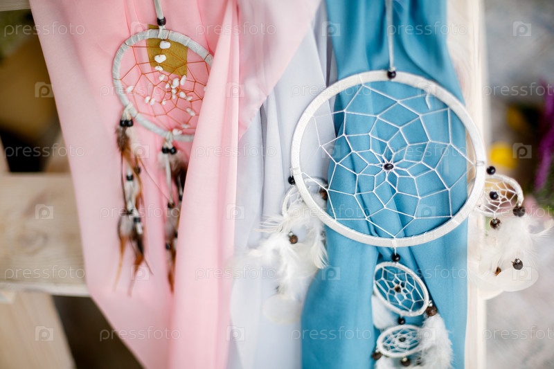 Два белых ловца снов висят на фоне ткани