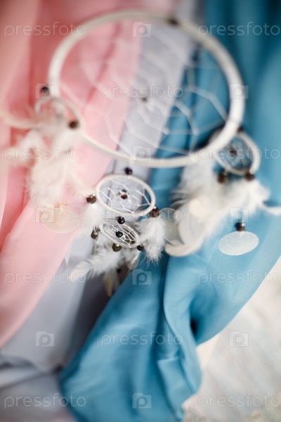 Белый ловец снов висит на фоне цветной ткани