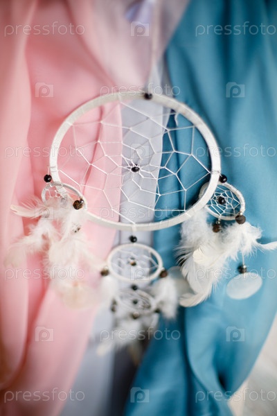 Белый ловец снов висит на фоне цветной ткани