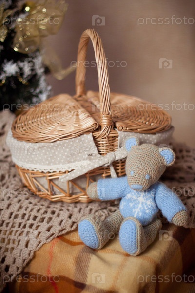 Вязаная игрушка мишка или мышка сидит возле плетеной корзины