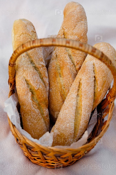 Три свежих багета лежат в плетеной корзине