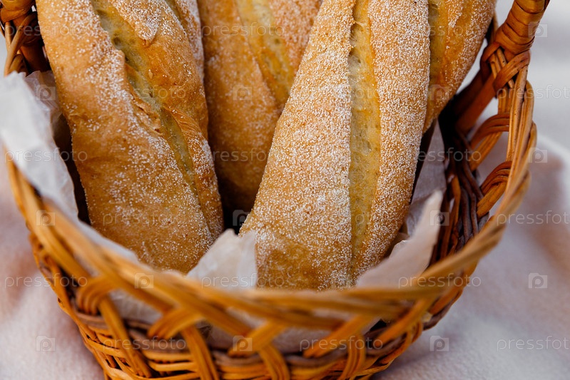 Три свежих багета лежат в плетеной корзине
