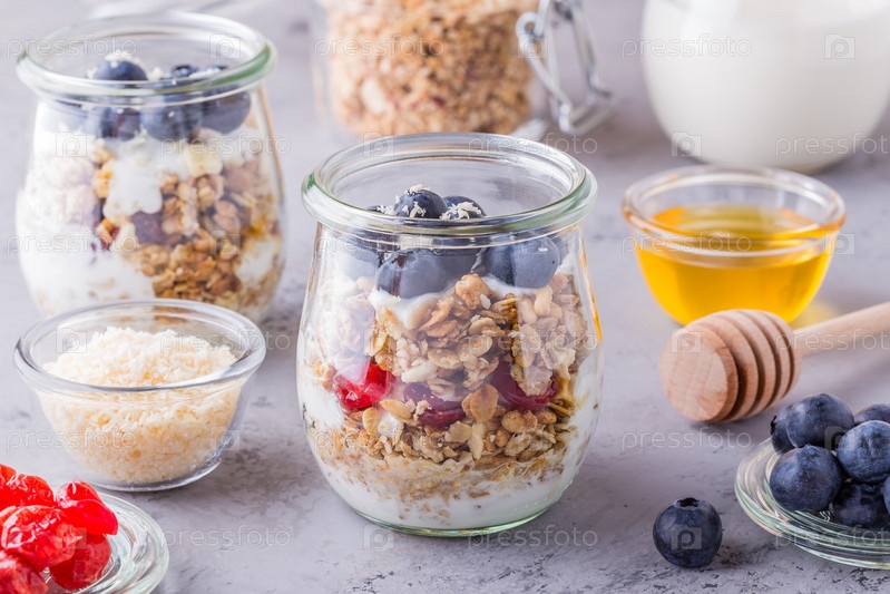 Здоровый завтрак - стеклянные банки овсяных хлопьев со свежими фруктами, йогуртом и медом