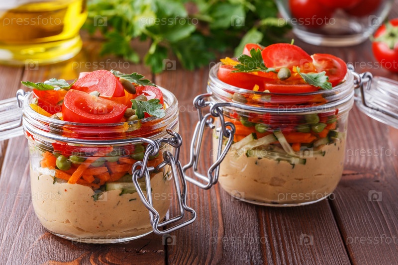 Здоровый завтрак - хумус с овощами в стеклянных банках