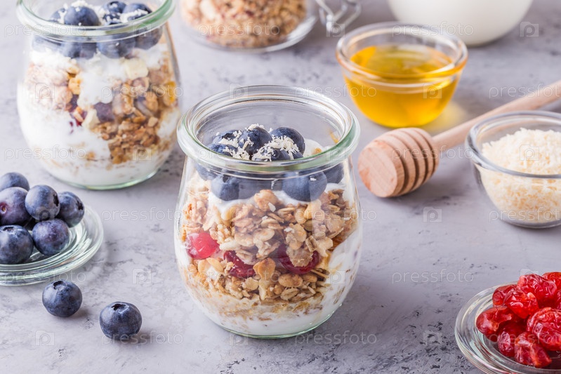 Здоровый завтрак - стеклянные банки овсяных хлопьев со свежими фруктами, йогуртом и медом