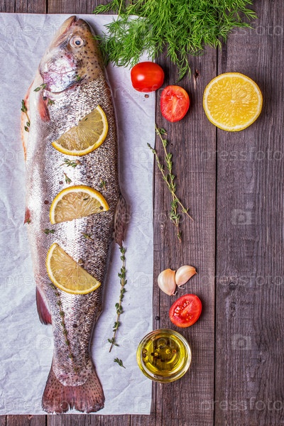 Сырая форель со специями на темном фоне
