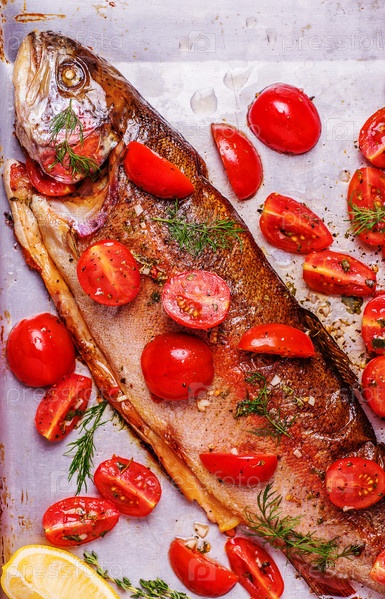 Запеченная форель с маринованными помидорами на противне