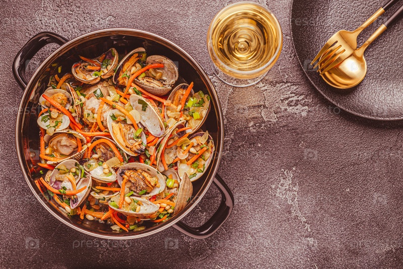 Раковины моллюсков вонголе с овощами и зеленью