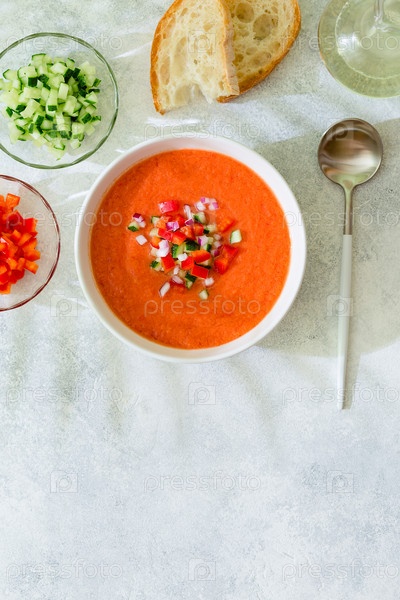 Традиционный испанский холодный томатный суп из свежих сырых овощей