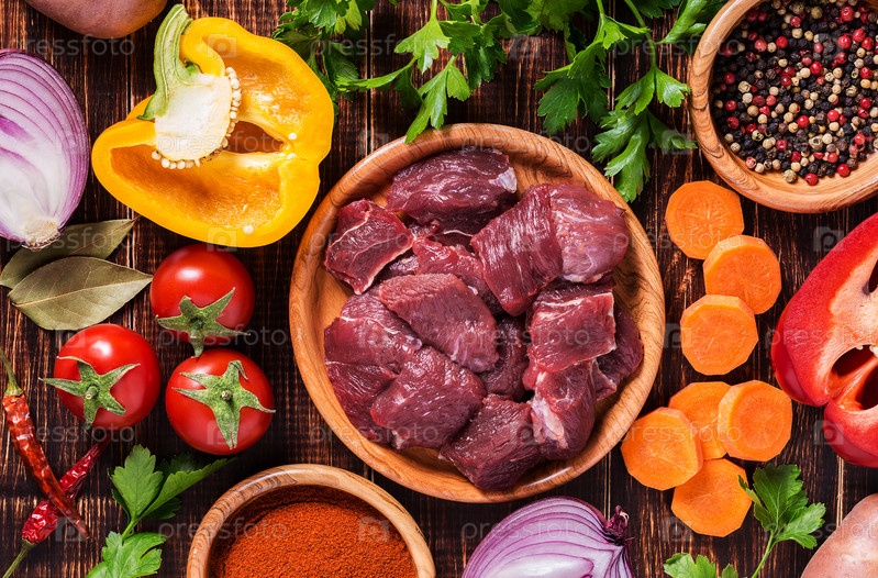 Ингредиенты для приготовления гуляша или тушеного мяса: сырое мясо, травы, специи, овощи на темном деревянном фоне