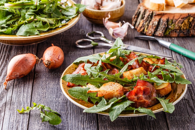 Салат из свежих одуванчиков с жареным беконом и чесночными гренками