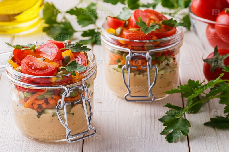Здоровый завтрак - хумус с овощами в стеклянных банках