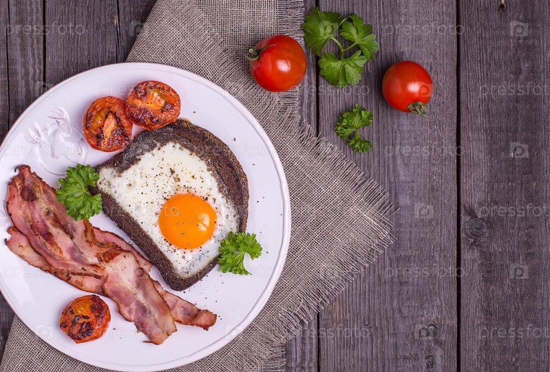 Яичница в ржаном хлебе с беконом, помидорами и петрушкой по-деревенски