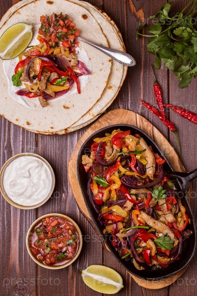 Фахитас из свинины с луком и цветным перцем, подается с лепешками, сальсой и сметаной