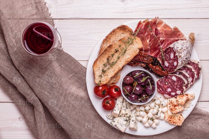 Набор винных закусок. Разнообразие сыра и мяса, оливки, помидоры на белом фоне