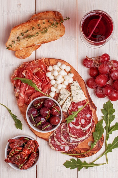 Набор винных закусок. Разнообразие сыра и мяса, оливки, виноград, руккола на белом фоне