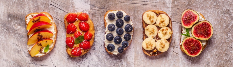 Домашний летний тост со сливочным сыром, ореховым маслом и фруктами и ягодами