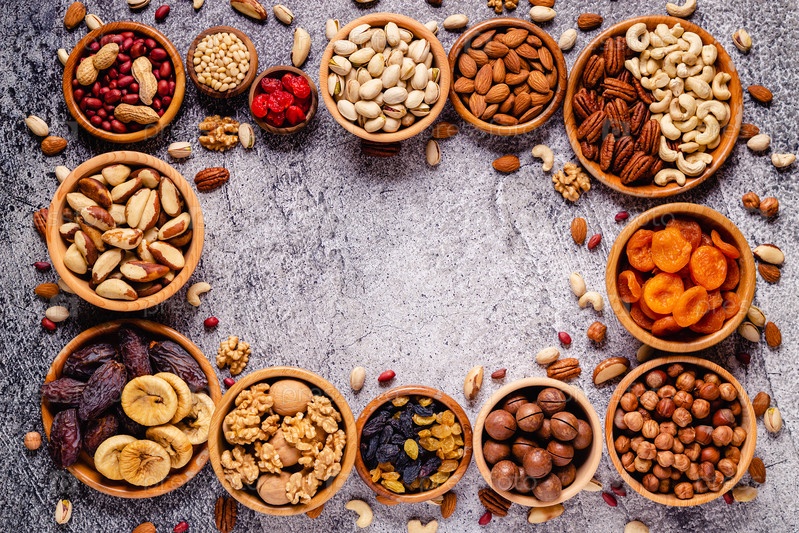 Различные орехи и сухофрукты в деревянных мисках