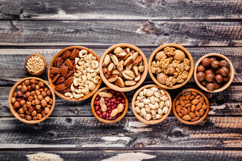 Различные орехи в деревянных мисках