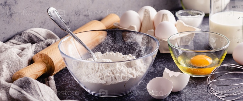 Ингредиенты для приготовления теста, яиц, муки, сахара, молока