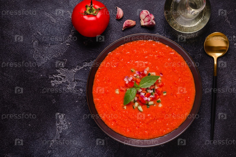 Традиционный испанский холодный томатный суп из свежих сырых овощей