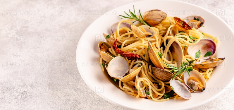 Паста из морепродуктов с моллюсками Спагетти алле Вонголе на светлом фоне