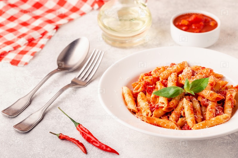 Классическая итальянская паста пенне алла аррабиата со свежим базиликом на светлом фоне