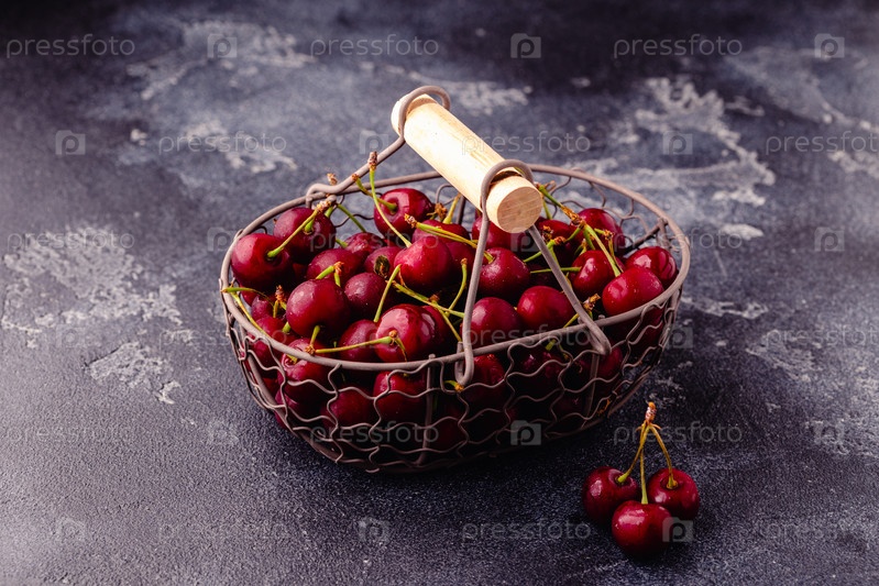 Свежие сладкие красные вишни в корзине на темном фоне