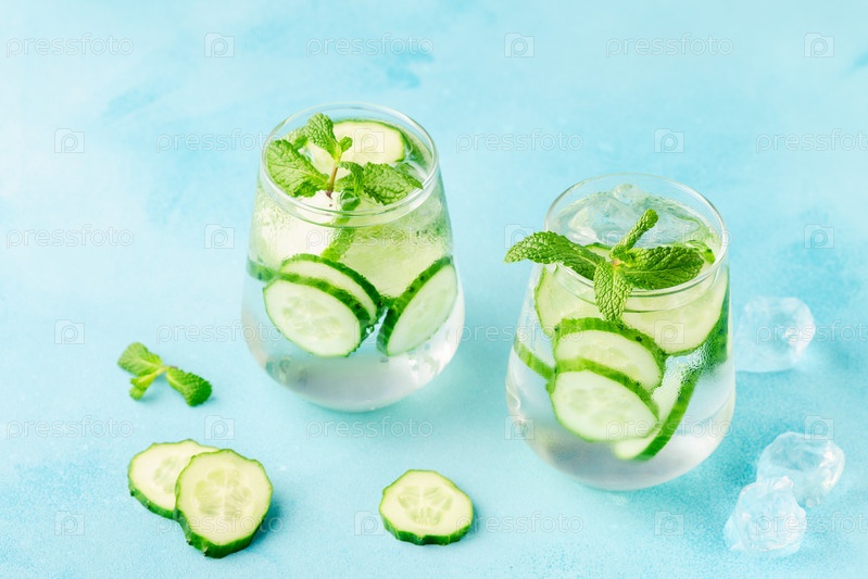 Свежая огуречная вода на голубом фоне