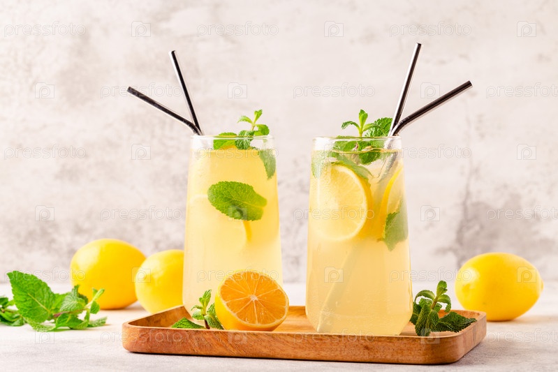 Лимонад с лимоном, мятой и кубиками льда в стакане