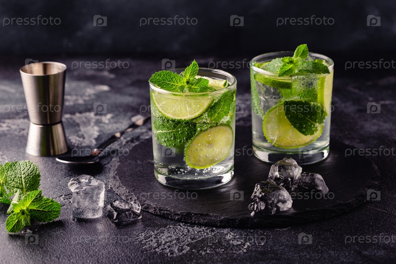 Освежающий летний алкогольный коктейль мохито со льдом, свежей мятой и лаймом