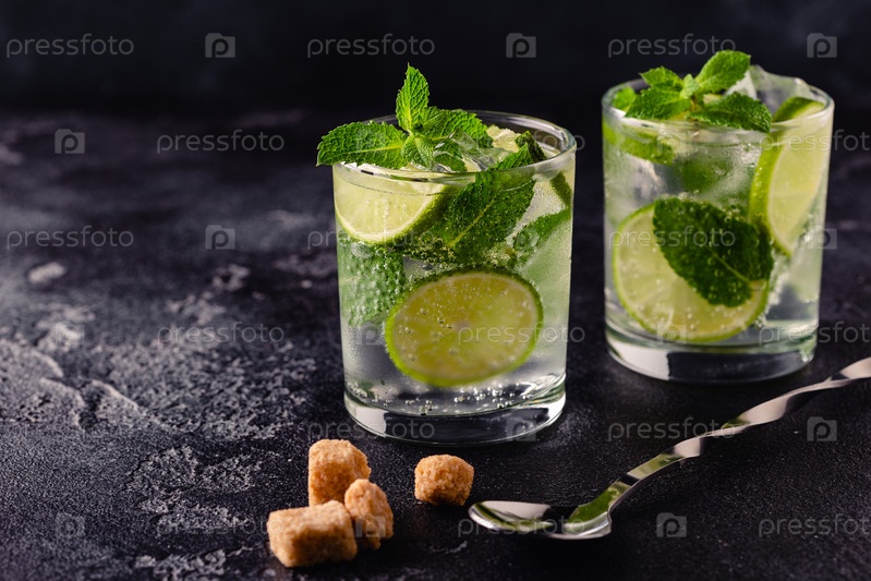 Освежающий летний алкогольный коктейль мохито со льдом, свежей мятой и лаймом