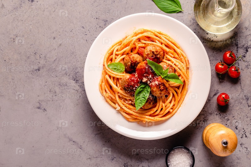 Спагетти с фрикадельками и томатным соусом на каменном фоне